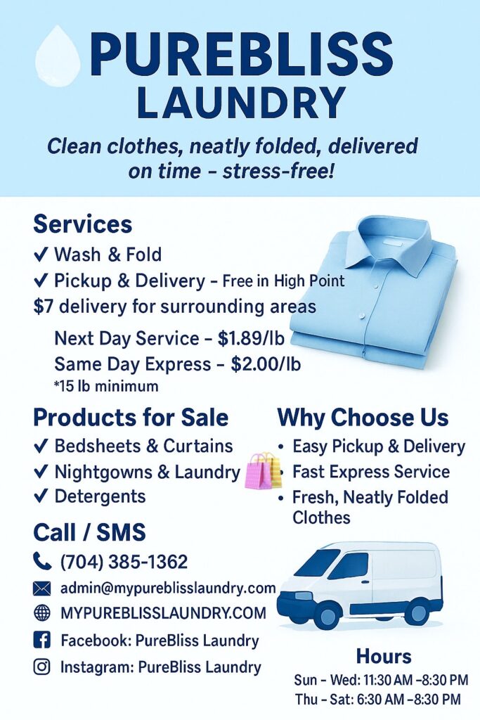 PureBliss Laundry LLC was created with busy lives in mind. We understand that time is precious, which is why we provide a professional wash and fold service right here in High Point and nearby areas. Our mission is to make laundry simple, stress-free, and convenient for you.